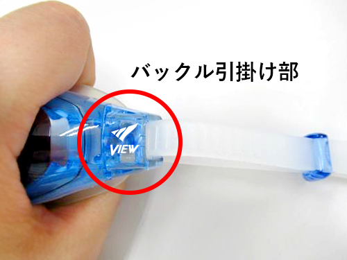 2.もう片方の手でバックルを握ります。バックルのロゴ上に親指を添え、バックル裏側のストラップが折り返している部分に人差し指を添えます。もう片方の手はしっかりとレンズを握ったままです。