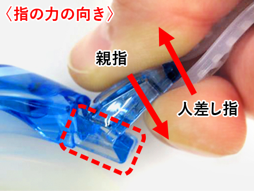 3.テコの原理を用いて、右図の指の力の向きのように親指でバックルを抑えながら人差し指を上へ持ち上げます。 左図の赤枠内はレンズの一部のため人差し指が赤枠部にかからないように注意してください。